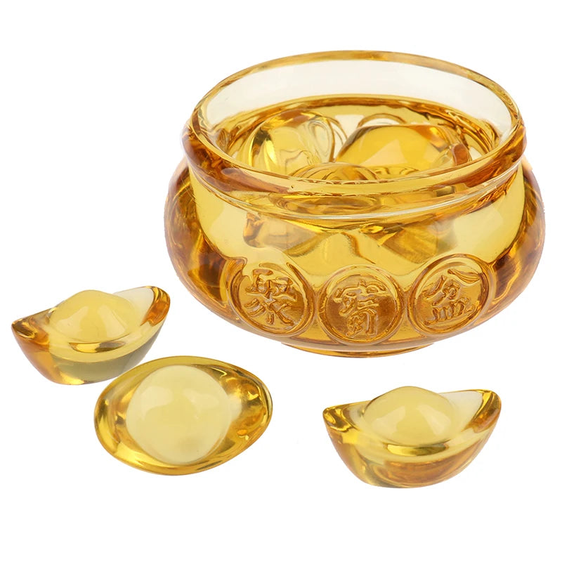 Set of Feng Shui golden treasure bowls with crystal gold ingots for wealth, abundance, and prosperity decoration